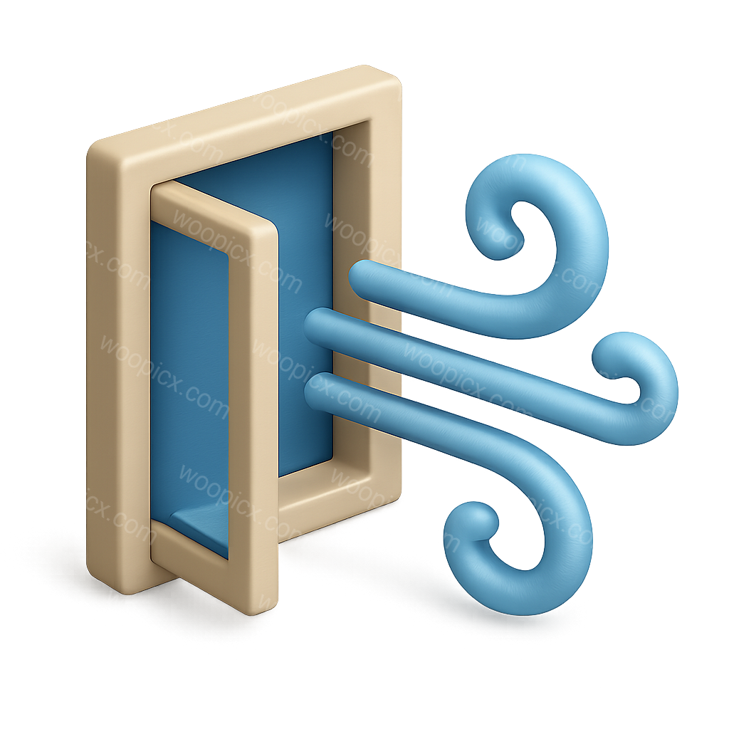 A stylized 3D representation of wind flowing through a rectangular opening. The icon features soft, curved blue lines symbolizing airflow against a neutral background.
