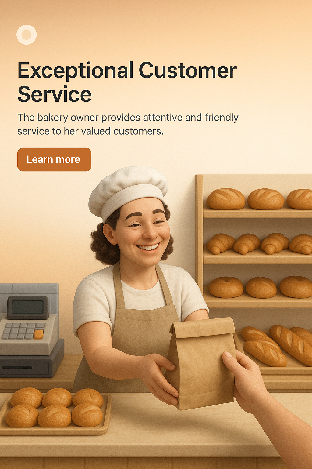 /Collection: /by davooda/Type: PNG/A warm and inviting scene depicting a smiling female baker in her shop, handing a customer a paper bag filled with baked goods, showcasing excellent customer service.