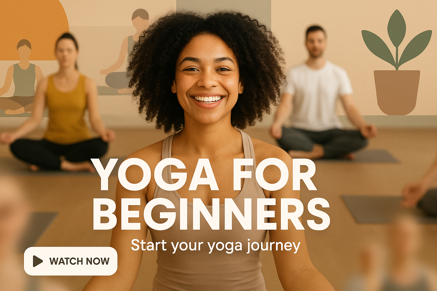 Inviting promotional banner for a yoga class tailored for beginners, featuring a smiling instructor and a calm environment, ideal for wellness marketing.