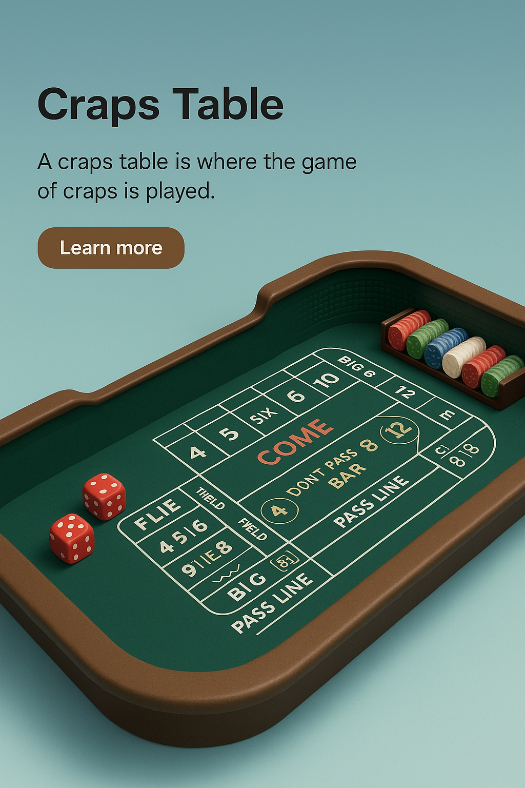 A zoomed-out, realistic 3D illustration of a craps table, featuring game elements like dice, chips, and a text block with a call-to-action button.
