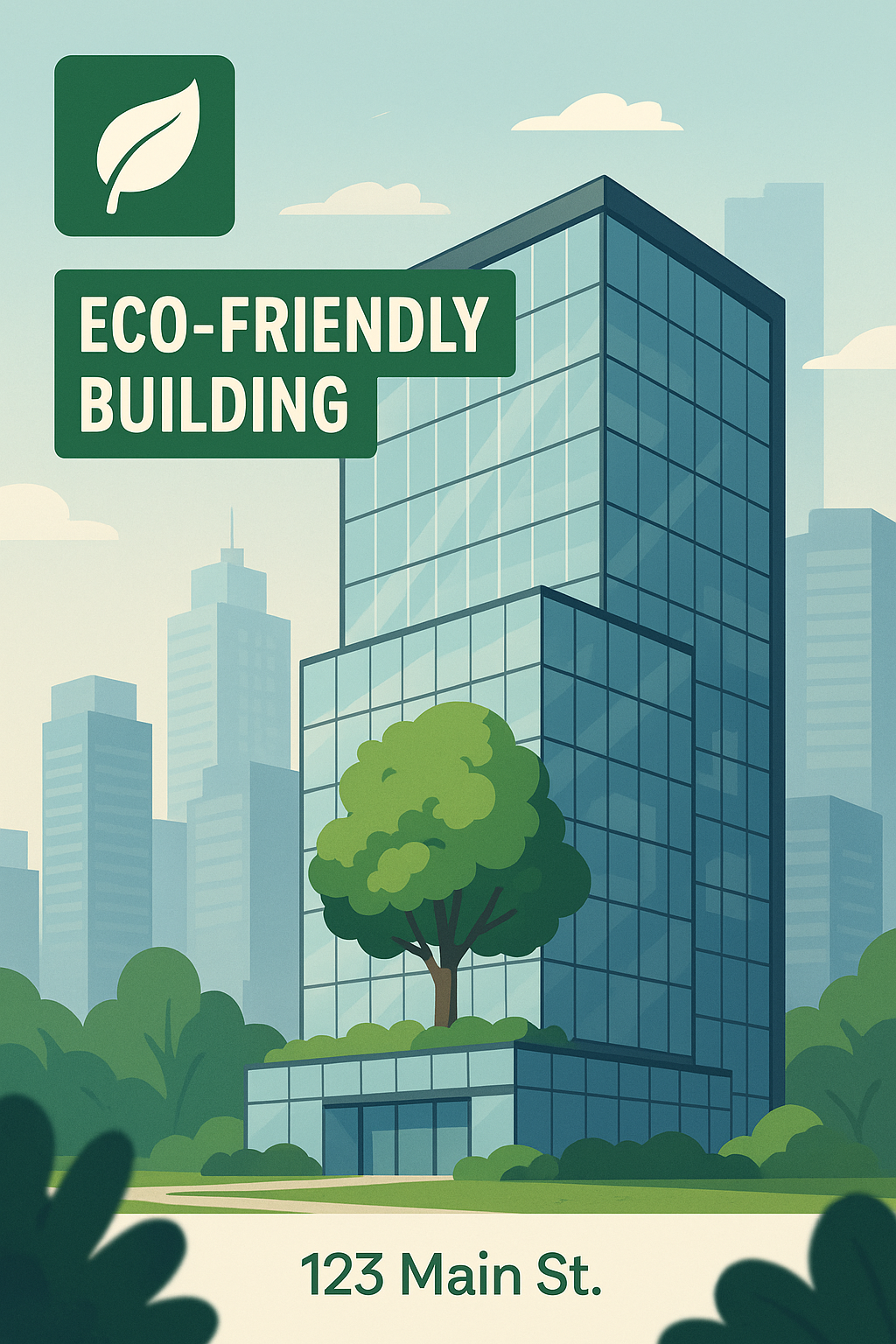 /Collection: /by davooda/Type: PNG/Stylized graphic illustration of a modern eco-friendly building surrounded by greenery, suitable for environmental campaigns or urban development projects.