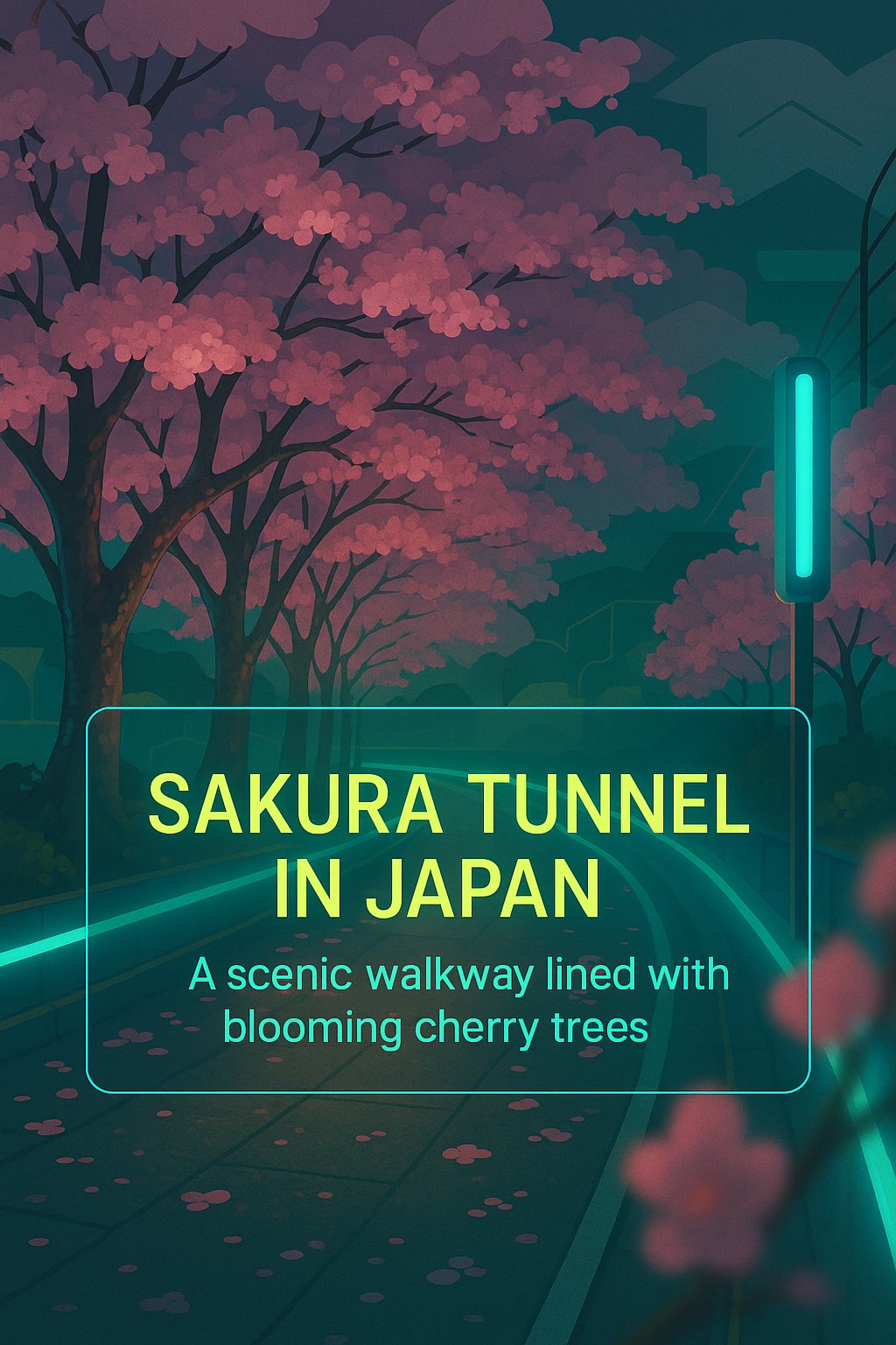 Vibrant digital illustration depicting a serene walkway adorned with cherry blossom trees, ideal for travel and cultural promotion.