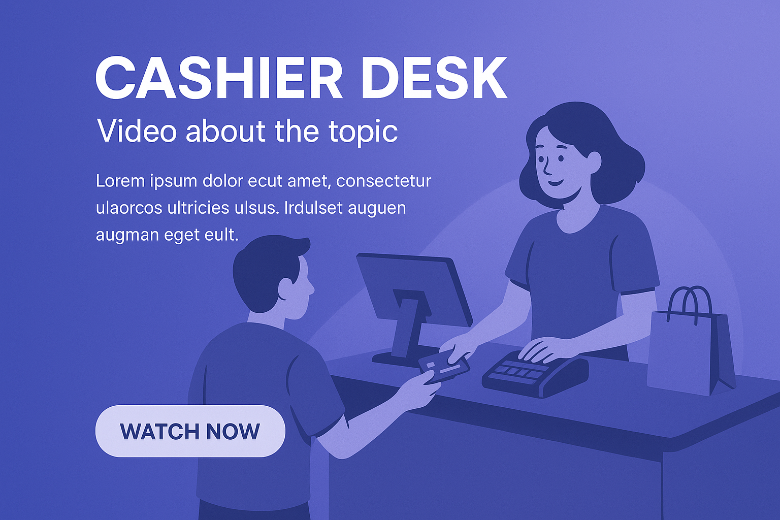 A professional and engaging design showcasing a cashier desk. The background features a simple gradient, while the main element depicts a cashier interacting with a customer, creating a dynamic atmosphere.