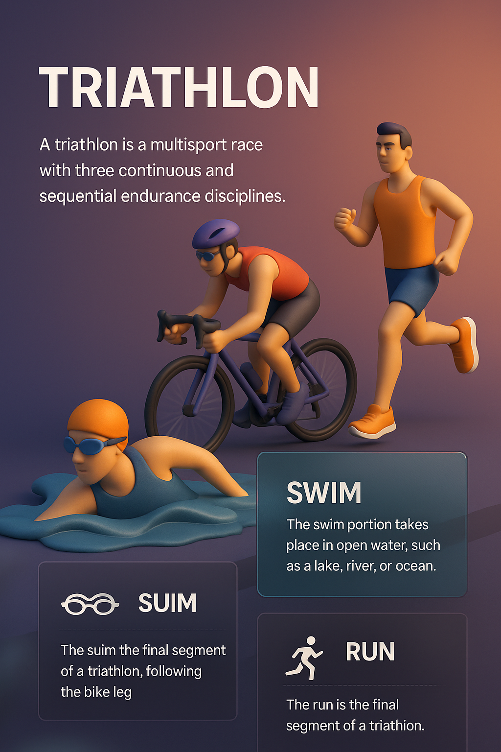 /Collection: /by davooda/Type: PNG/A vibrant 3D illustration depicting triathletes in action, with clear informational blocks highlighting swim, bike, and run segments, all on a smooth gradient background.