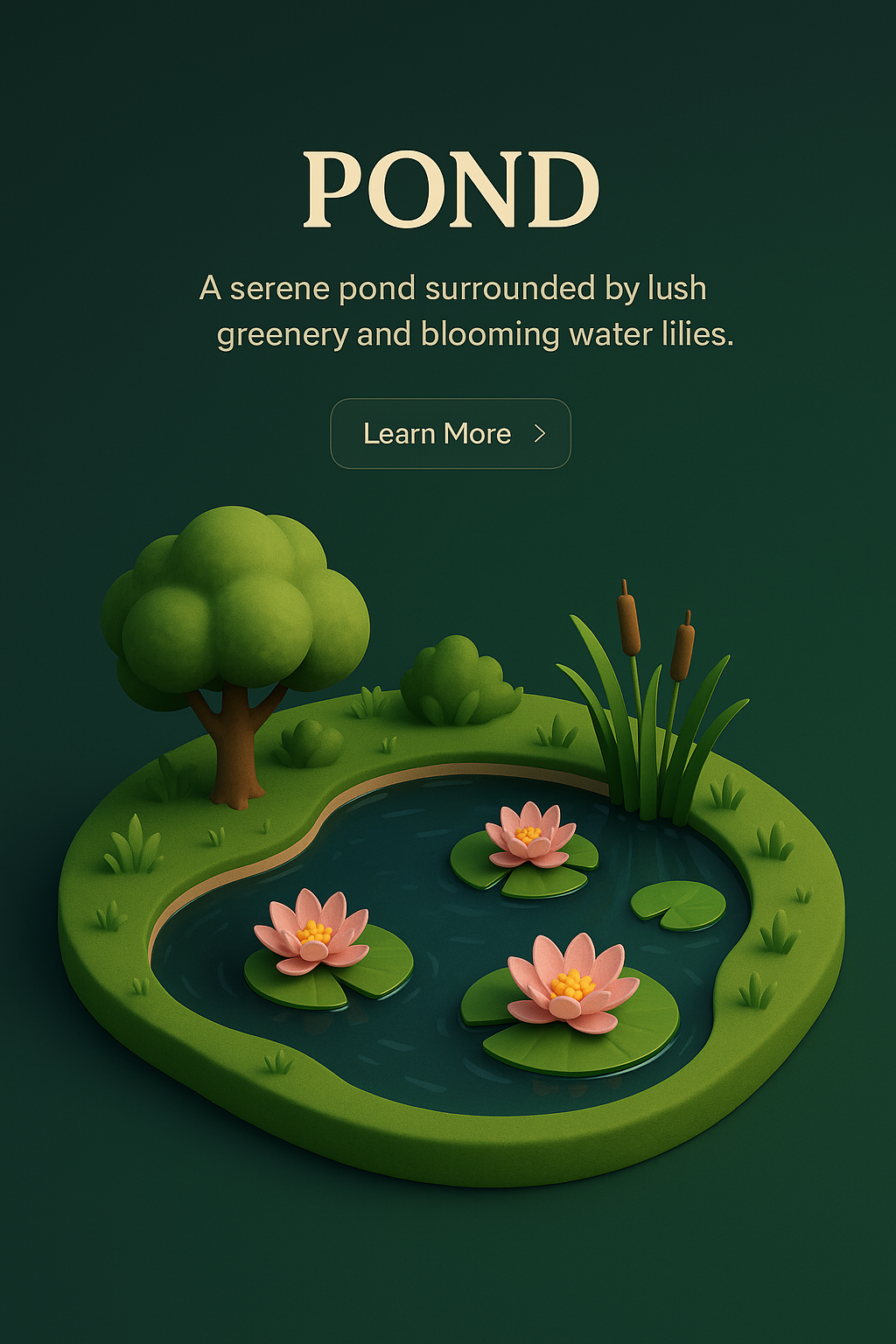 A tranquil 3D representation of a pond featuring blooming water lilies and lush greenery. The scene is designed with a dark gradient background, emphasizing the vibrant colors of nature.