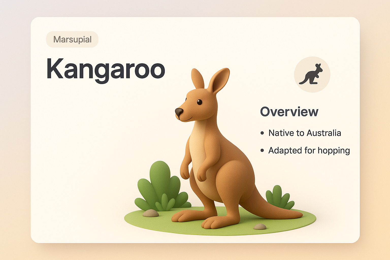 /Collection: /by davooda/Type: PNG/A bright and engaging 3D illustration of a kangaroo, featuring a smooth gradient background and an overview section highlighting its native habitat and adaptation for hopping.