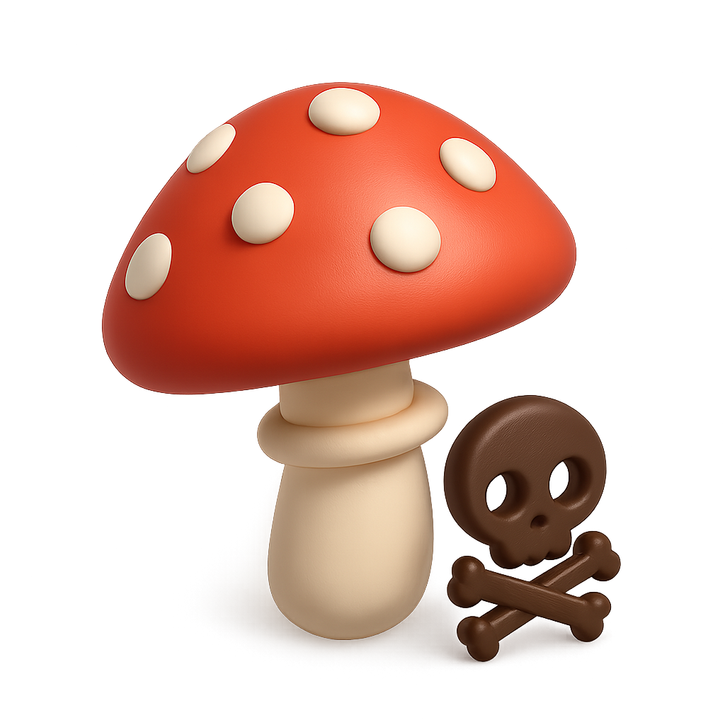 /Collection: /by davooda/Type: PNG/A vibrant 3D representation of a poisonous toadstool with a red cap and white spots, accompanied by a skull and crossbones symbol, set against a soft gradient background.
