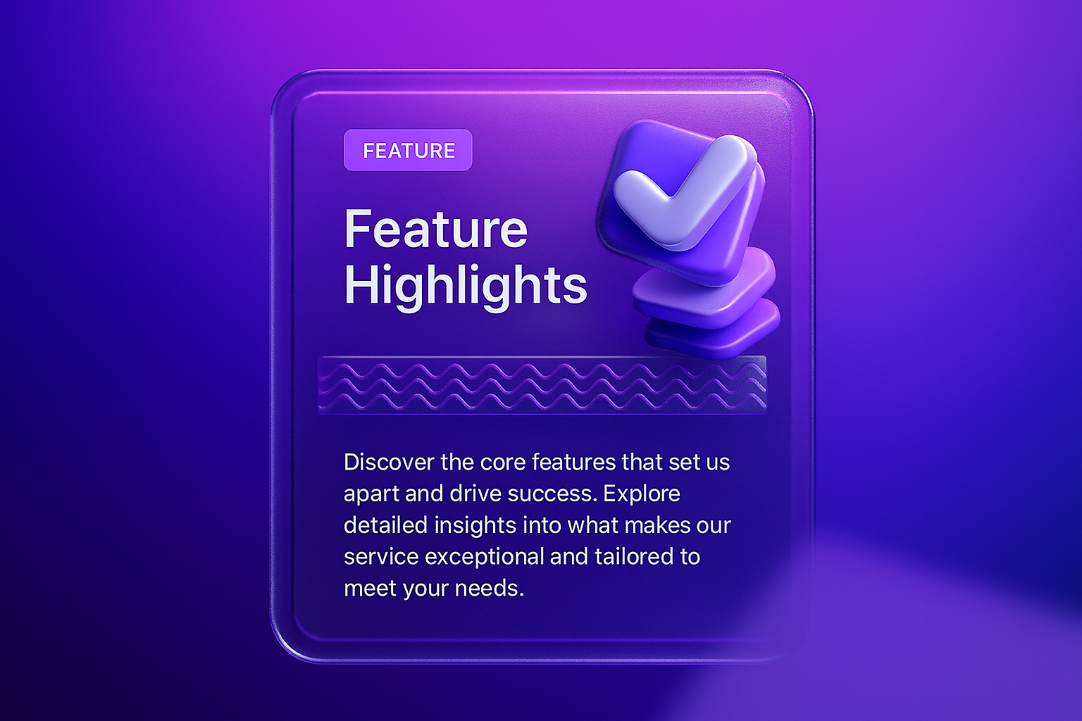 /Collection: /by davooda/Type: PNG/A visually striking 3D illustration featuring a purple gradient background. The design includes a transparent block showcasing feature highlights with subtle layers and dynamic elements.