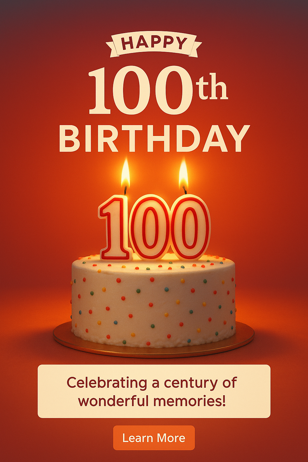 This image features a festive birthday cake with candles, designed for a 100th birthday celebration. The warm color palette and celebratory text make it ideal for invitations or social media posts.