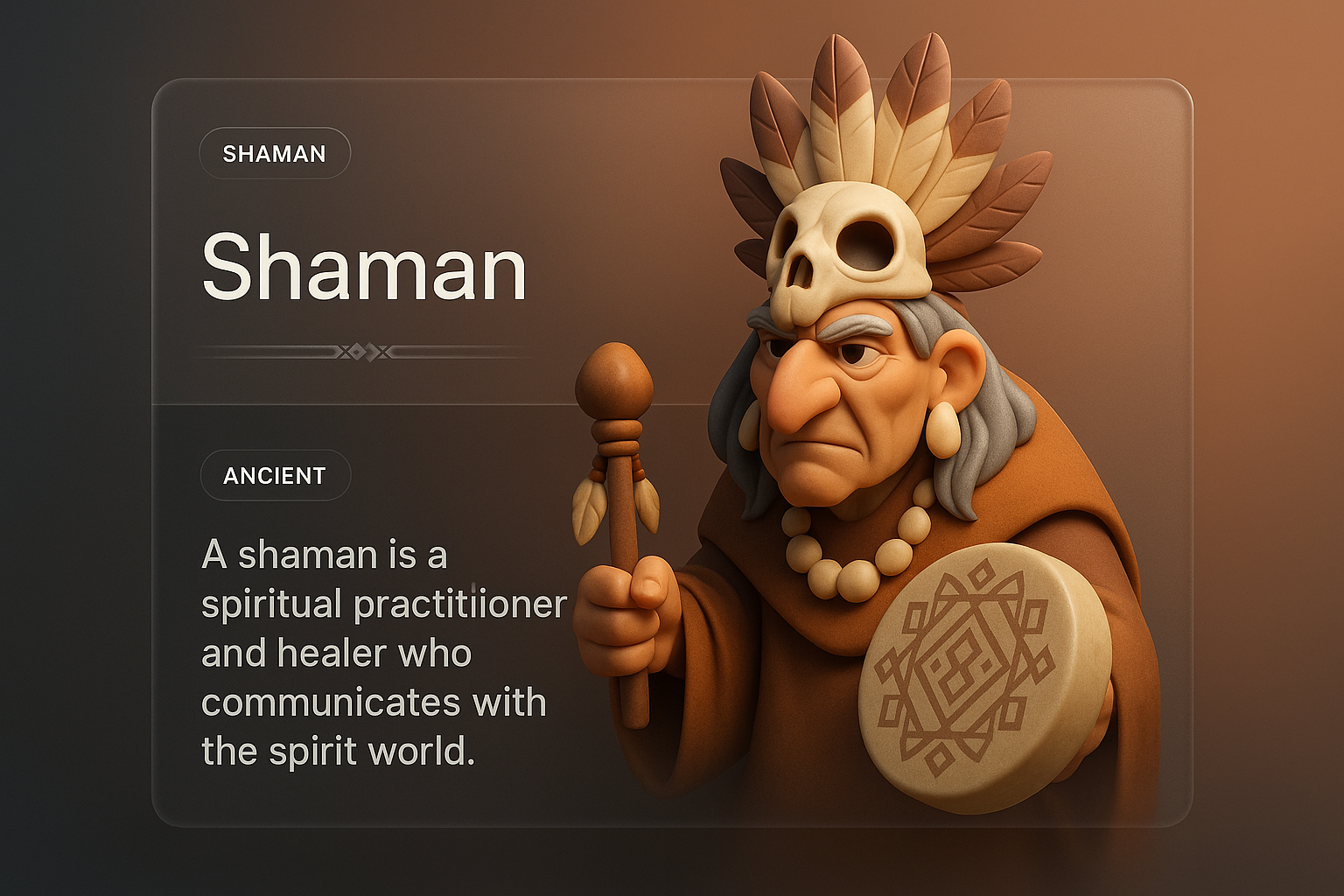 /Collection: /by davooda/Type: PNG/A detailed 3D shaman character stands prominently, holding a drum and staff, with a sleek gradient background. Text overlays describe the shaman's role, integrated seamlessly.