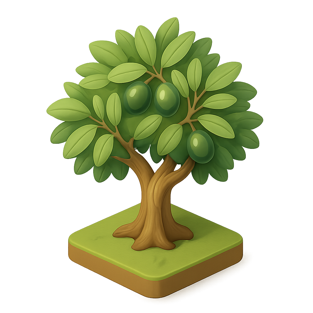 A vibrant 3D icon of an olive tree featuring a leafy canopy and ripe olives, set against a soft gradient background. The design highlights volumetric details.
