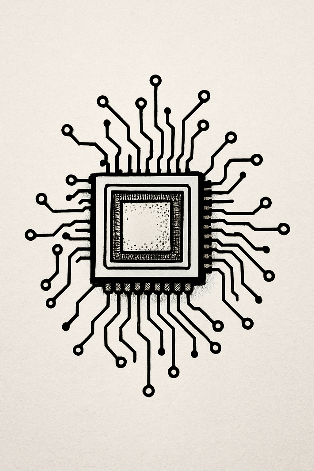/Collection: /by davooda/Type: PNG/This image features an artistic depiction of a microchip surrounded by circuit lines, showcasing a blend of technology and creativity. Suitable for tech-related content.