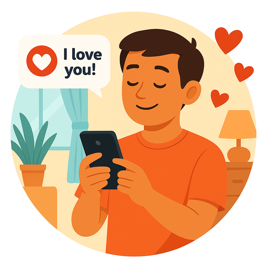 A colorful graphic depicting a person happily texting a love message, designed in a modern and playful style suitable for relationship-themed content.