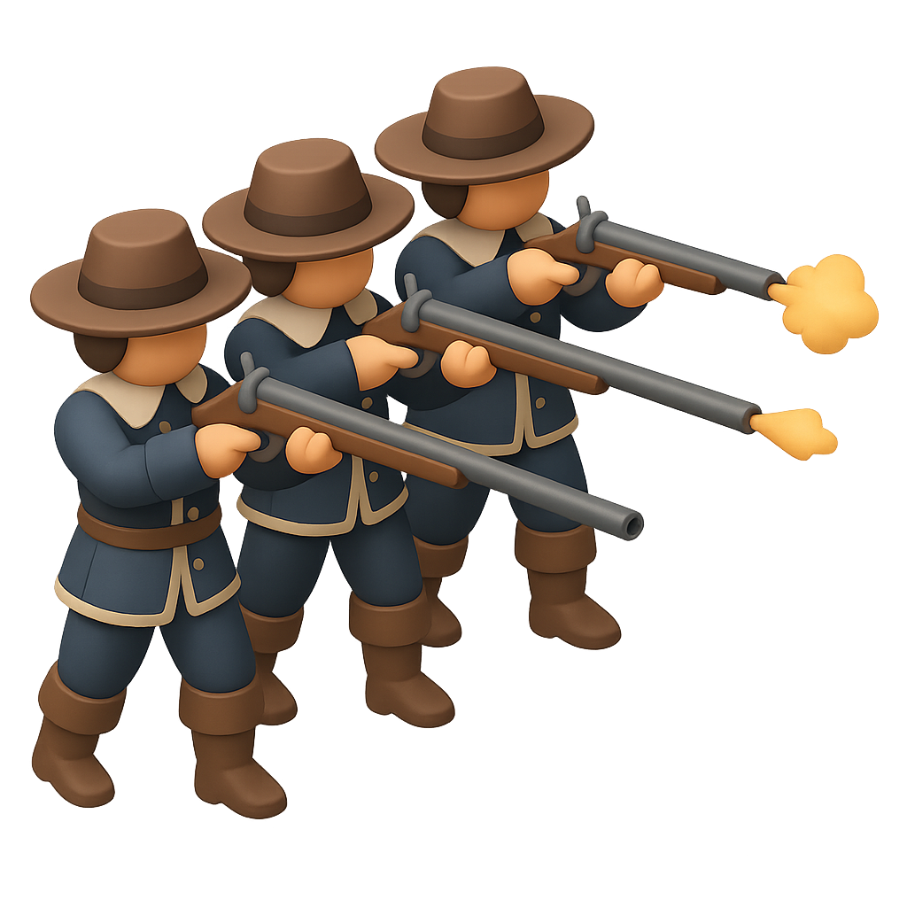 /Collection: /by davooda/Type: PNG/A stylized 3D icon depicting three musketeers in a firing line, each holding a musket. The illustration features a transparent background and a three-quarter isometric view, emphasizing a volumetric feel.