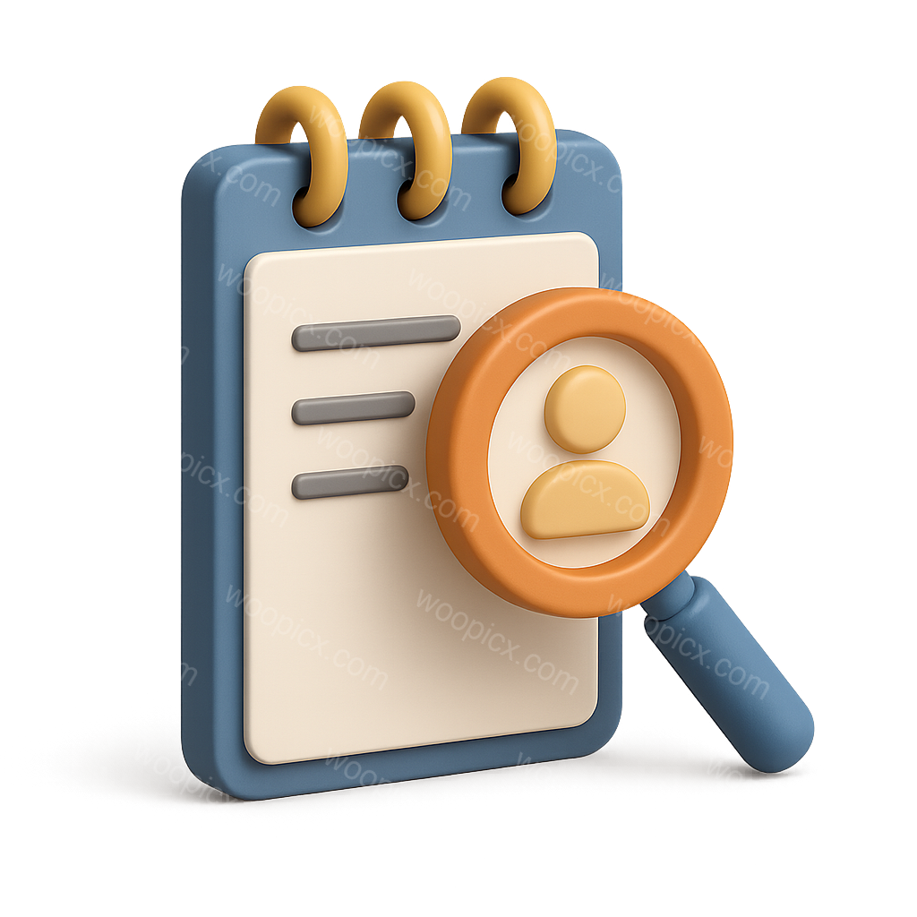 /Premium/Collection: /by davooda/Type: PNG/A stylized 3D icon featuring a notepad with a magnifying glass, symbolizing interview preparation. The design has a transparent background and a three-quarter isometric view.