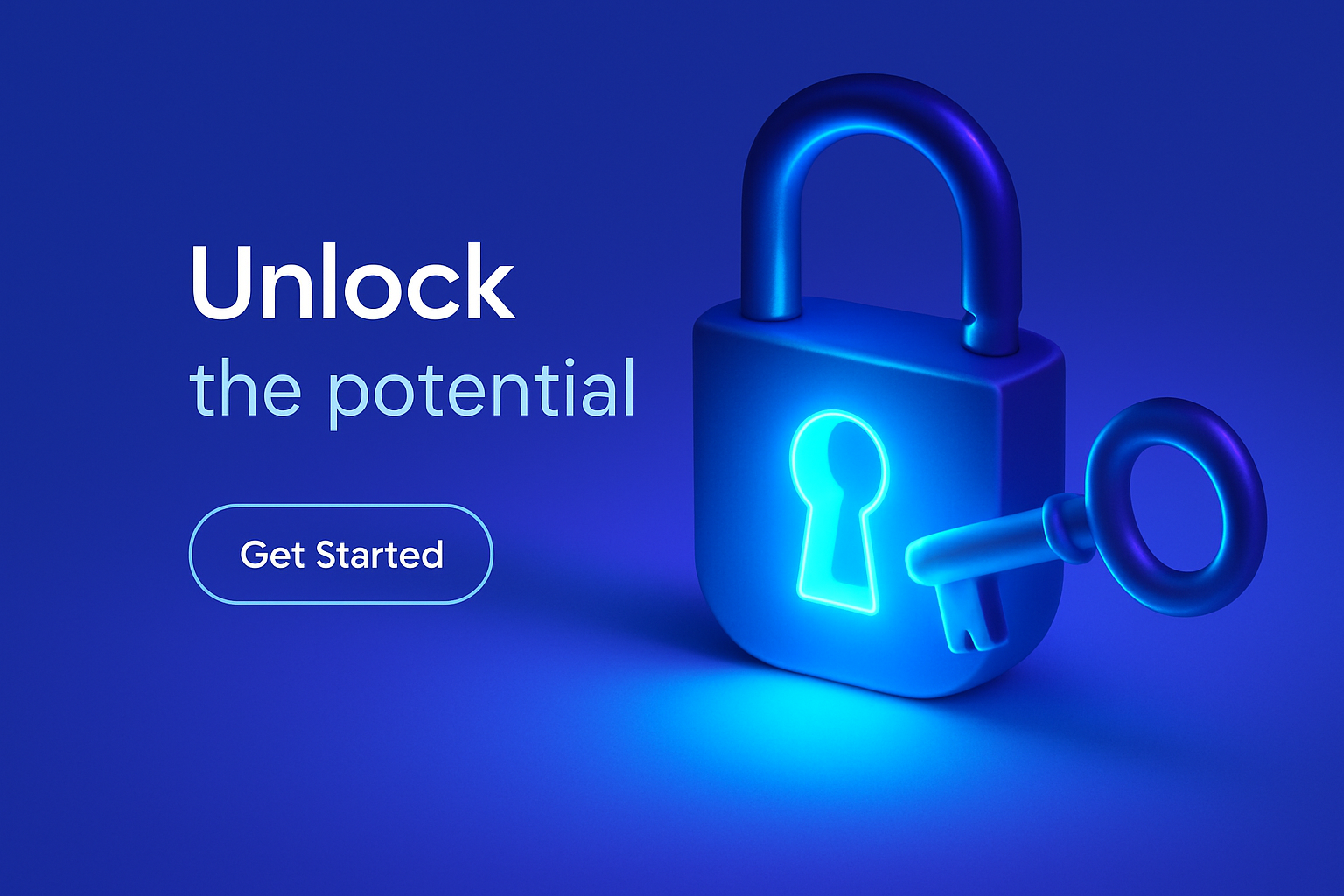 /Collection: /by davooda/Type: PNG/A visually striking scene featuring a glowing blue padlock and key. The padlock emits a vibrant light that creates a captivating atmosphere against a solid blue background, highlighting the theme of unlocking potential.