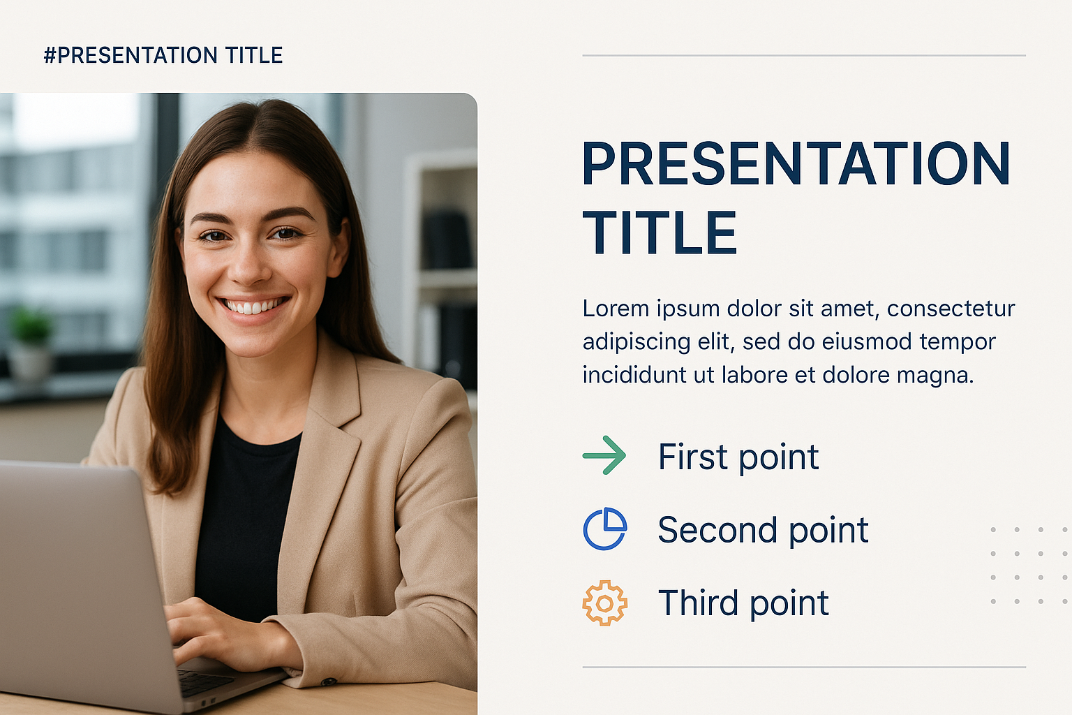 /Collection: /by davooda/Type: PNG/Clean and modern presentation template with a professional layout, ideal for showcasing key points. Features a smiling individual with a laptop, suitable for corporate or educational settings.