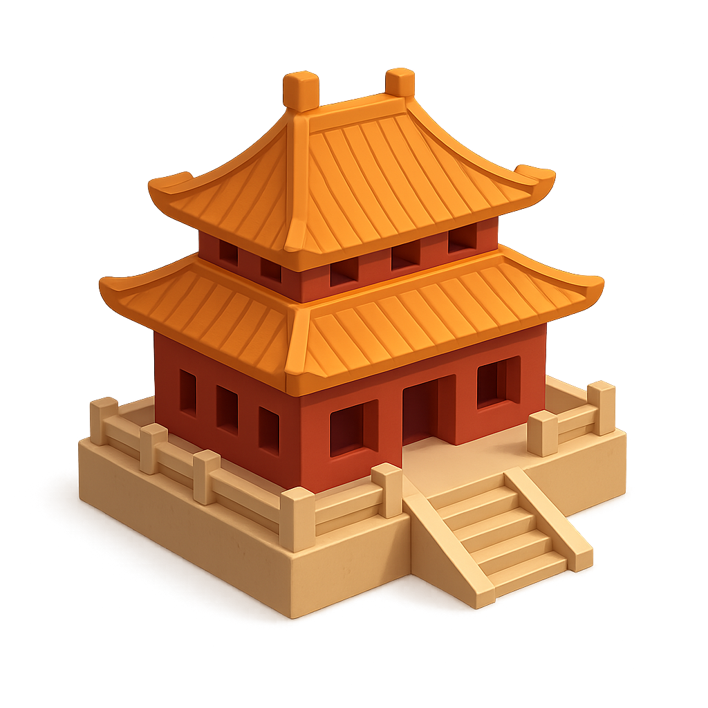 /Collection: /by davooda/Type: PNG/A stylized 3D representation of the Forbidden City in Beijing, featuring a traditional architectural design with orange roofs and a beige base. The icon is presented in a three-quarter view against a soft gradient background.