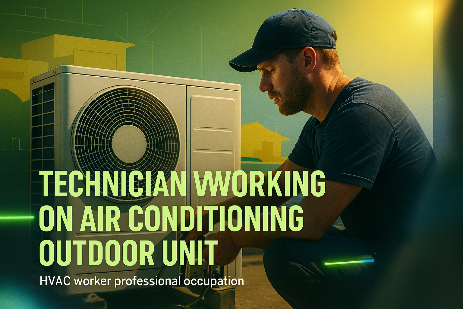 A professional HVAC technician performing maintenance on an outdoor air conditioning unit, showcasing the technical aspect of the occupation in a visually appealing style.