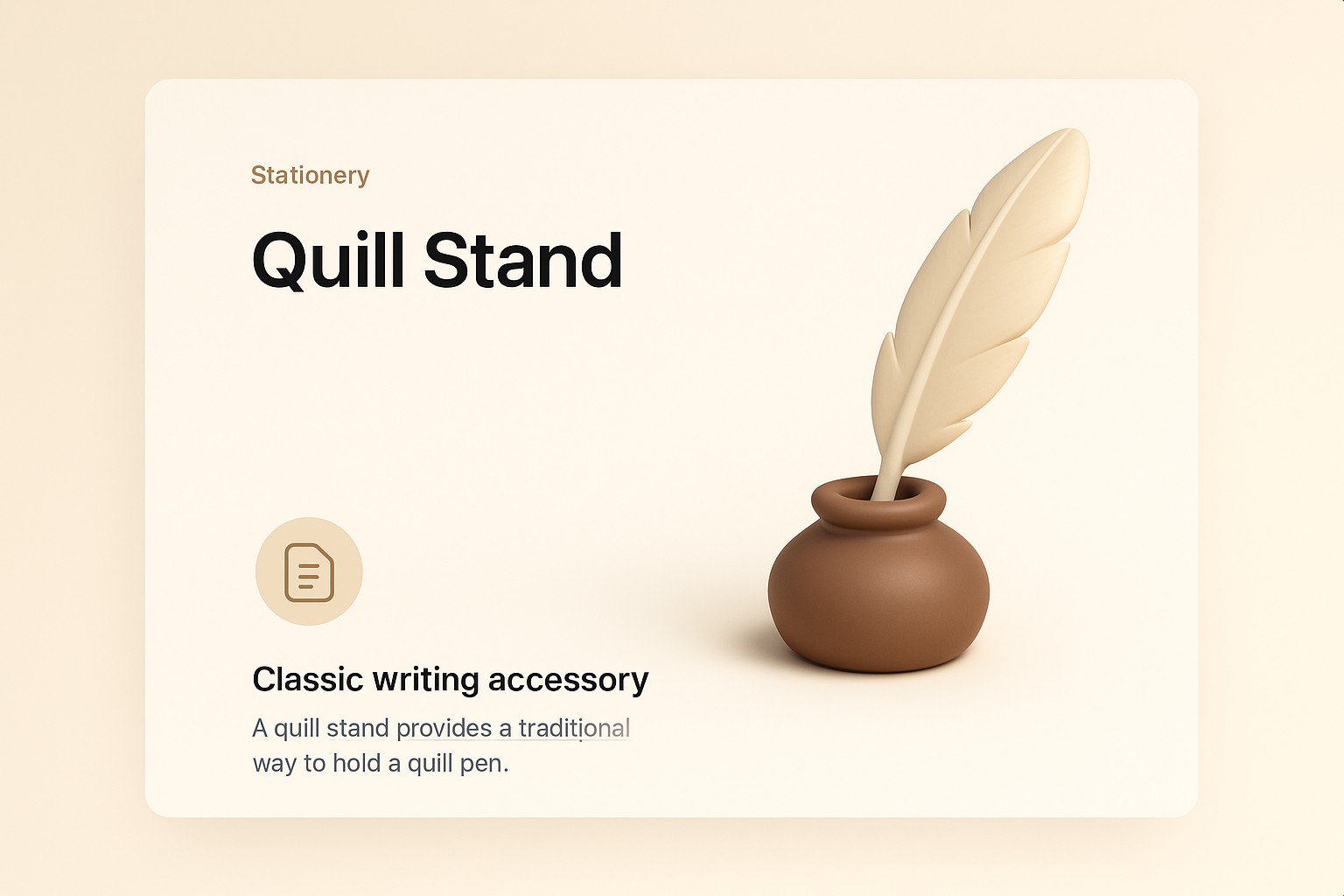 /Collection: /by davooda/Type: PNG/A 3D illustration of a quill stand featuring a brown ink pot and a beige feather. The design is minimalistic with a soft gradient background, embodying a classic writing accessory theme.