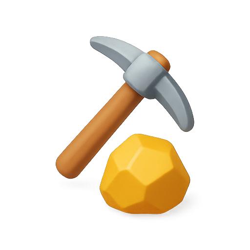 A stylized 3D illustration featuring a mining pickaxe and a gold nugget, suitable for use in gaming, apps, or educational materials related to mining and resources.