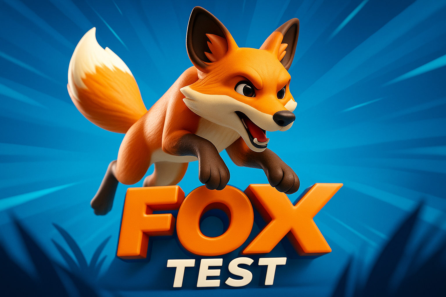 A vibrant 3D illustration of a fox in mid-leap, set against a smooth gradient background. The title 'FOX TEST' is prominently displayed in bold, engaging typography.