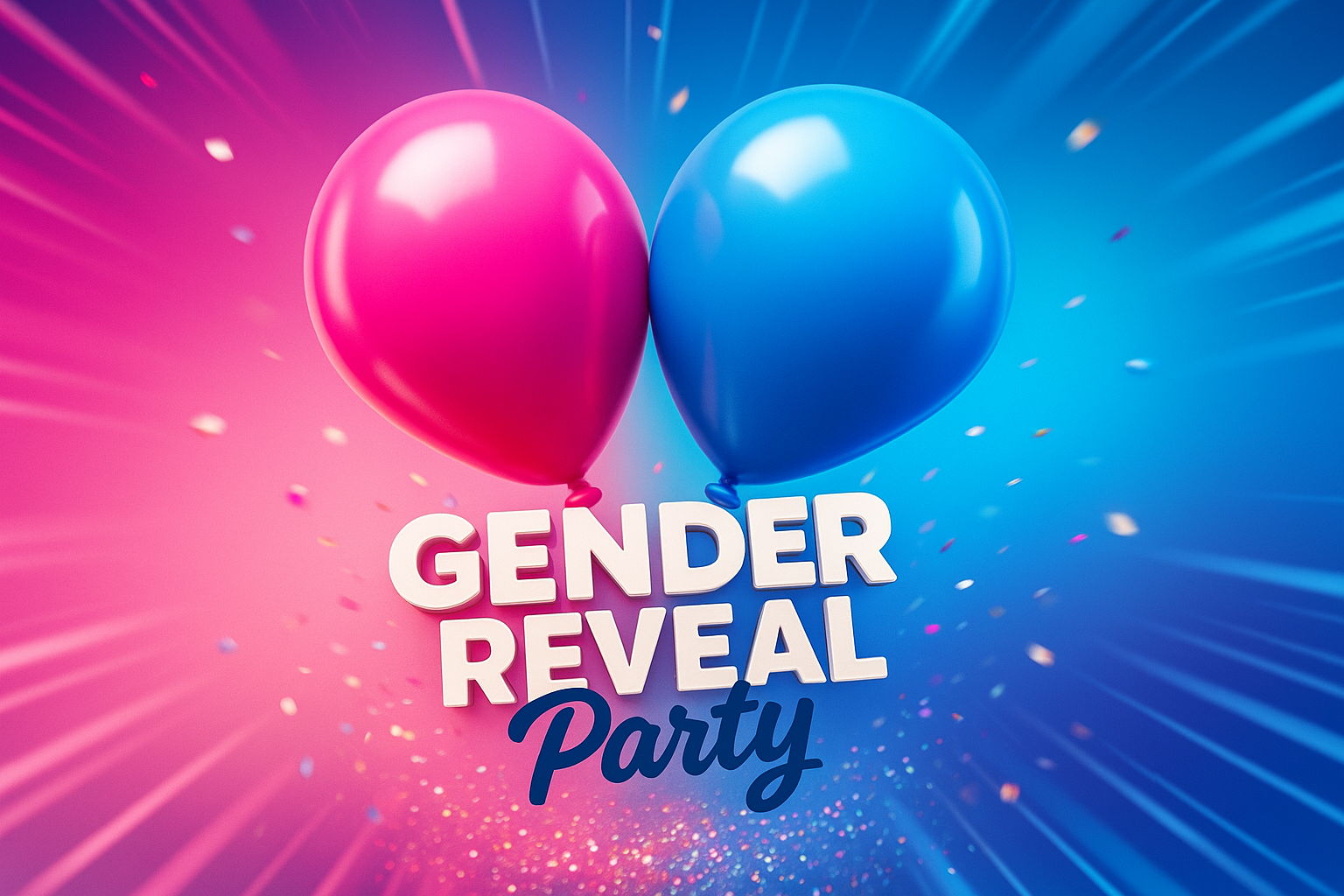 /Collection: /by davooda/Type: PNG/A vibrant invitation design featuring pink and blue balloons, with a dynamic burst of colors in the background. The text 'GENDER REVEAL PARTY' stands out in a stylish font, creating an engaging visual.