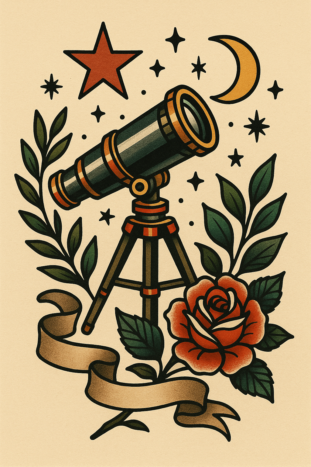/Collection: /by davooda/Type: PNG/This image features a vintage telescope surrounded by floral elements, stars, and celestial symbols, designed in a classic tattoo style. Ideal for art prints and themed decor.