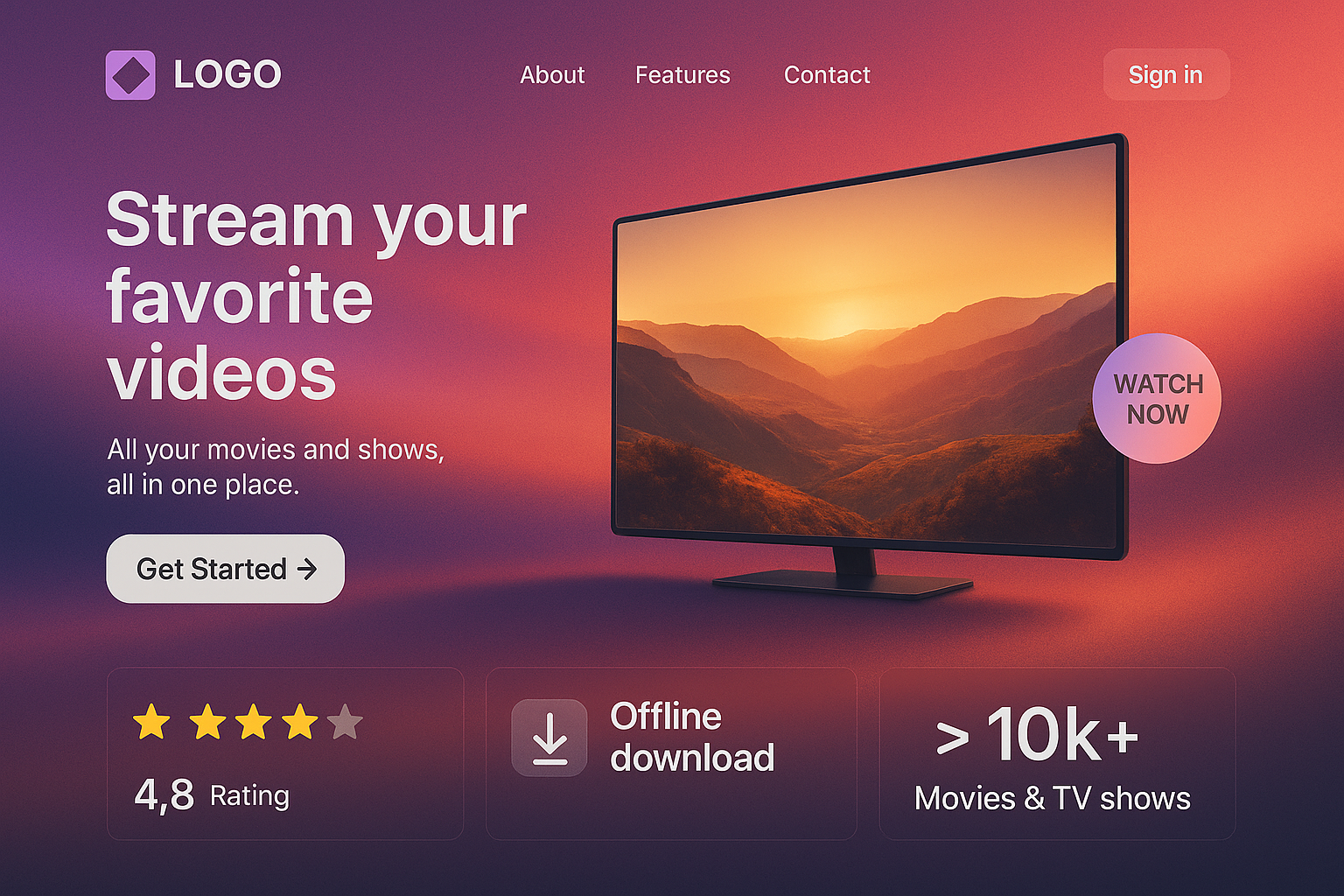 /Collection: /by davooda/Type: PNG/A vibrant and modern landing page design featuring a large monitor showcasing a scenic background. Includes a logo, navigation menu, action buttons, and user ratings.