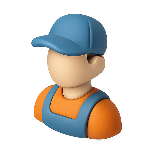 A stylized 3D representation of a construction worker, featuring a baseball cap and an orange uniform. Ideal for construction-related applications or websites.