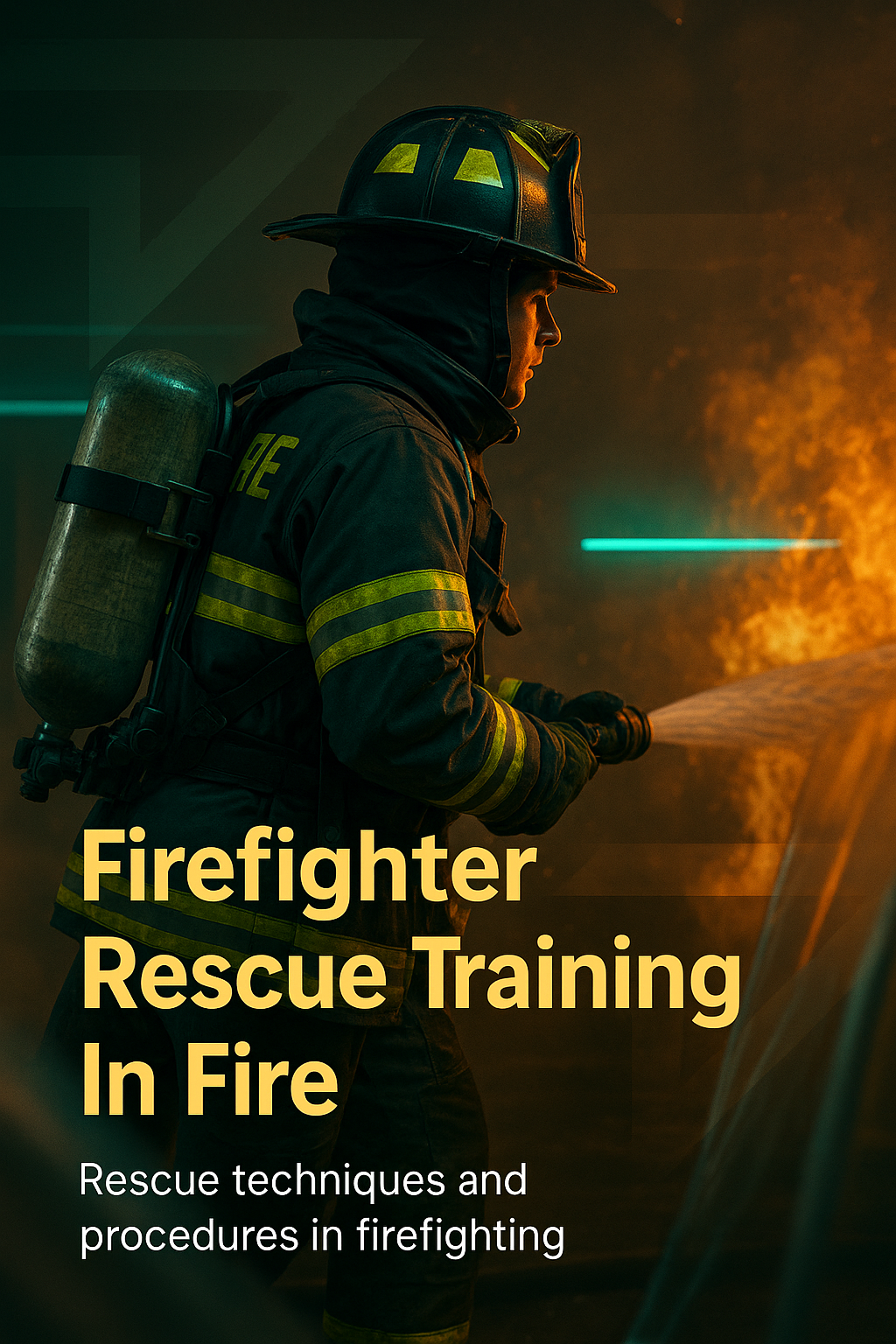 /Collection: /by davooda/Type: PNG/A compelling image showcasing a firefighter in action during a rescue training session amidst flames, emphasizing firefighting techniques and safety protocols.